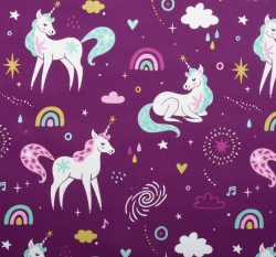 Softshell potisk pohádkoví jednorožci na fialové