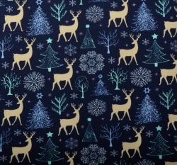 Teplákovina počesaná potisk jelínci mezi vánočními stromečky na modré