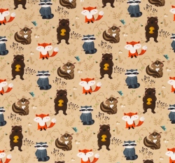 Teplákovina potisk lesní zvířátka na béžové, lehce počesaná