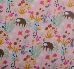 Teplákovina počesaná potisk lenošící zvířátka ve větvích na růžové, BIO