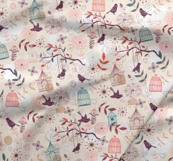Teplákovina potisk ptáčci v kleci mezi kvítky a srdíčky