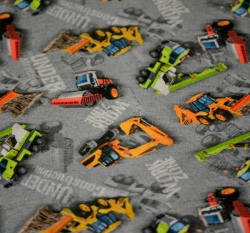 Úplet potisk pracovní stroje bagry a nákladní auta na šedé