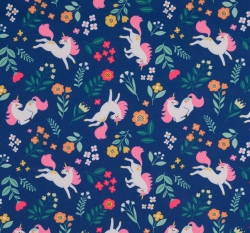 Softshell s fleecem potisk jednorožci mezi kvítky na modré
