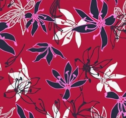 Viskózový úplet potisk barevné květy na červeném podkladu