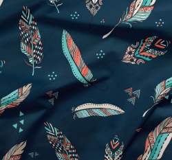Teplákovina potisk oranžovotyrkysová peříčka na tmavě modré