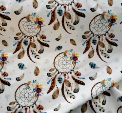 Teplákovina potisk lapače snů mezi květinami a peříčky na smetanové