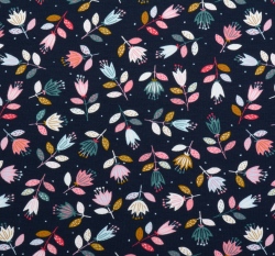 Teplákovina potisk malované tulipány na modré navy, BIO