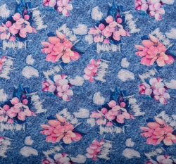 Teplákovina potisk růžové květy na potrhané džínovině