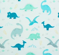 Teplákovina potisk modrý dinosaurus na bílé