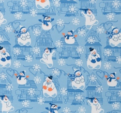 Teplákovina počesaná potisk sněhuláci před domky na modré