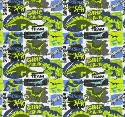 Teplákovina potisk dinosauři na modro-šedé, lehce počesaná