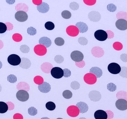 Bavlněný úplet růžová a modrá kolečka na bílé