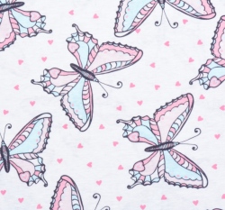 Bavlněný úplet motýlci v pastelových barvách na bílé