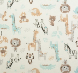 Bavlněný úplet potisk tyrkysová safari zvířátka na bílé