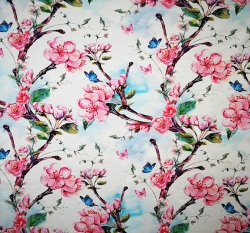 Teplákovina potisk rozkvetlá třešeň s motýlky na obloze