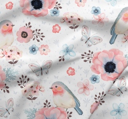 Softshell potisk ptáčci mezi motýlky a květy na bílé