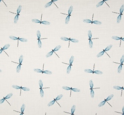 Dvojitá gázovina/ mušelín potisk modré poletující vážky na bílé