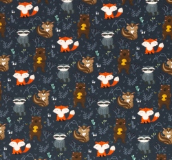 Teplákovina potisk lesní zvířátka na tmavě modré, lehce počesaná