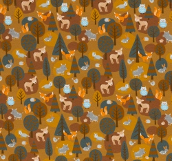 Teplákovina potisk lesní zvířátka na okrové, lehce počesaná