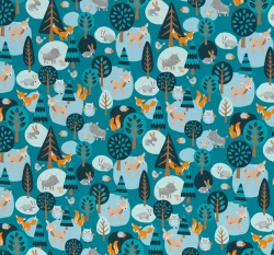 Teplákovina potisk lesní zvířátka na petrolejové, lehce počesaná