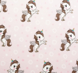 Teplákovina potisk bílí jednorožci mezi kroužky na zaprášené růžové