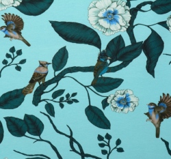 Úplet potisk květy a ptáčci na modrém podkladu