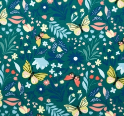 Teplákovina potisk motýlci a květiny na petrolejově modré