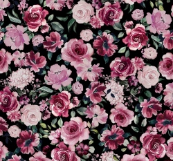 Teplákovina počesaná potisk rozkvetlé růžové květy na černé, BIO
