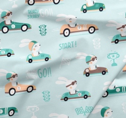 Teplákovina potisk závodící zajíčci v autě na zelinkavé