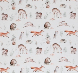 Bavlněný popelín potisk lesní zvířátka na bílé