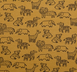 Teplákovina počesaná potisk safari zvířátka na okrové, BIO