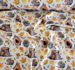 Teplákovina potisk sovička, ježeček mezi pařezy a podzimní listí