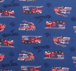 Bavlněný úplet hasičské auto na jeansu