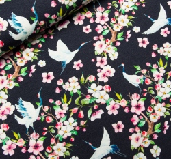 Teplákovina potisk jeřábi mezi květy višní na tmavě modré