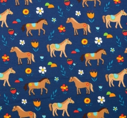Úplet potisk koníci mezi kytičkami na tmavě modré