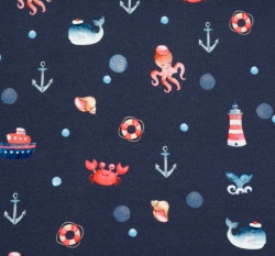 Úplet potisk mořský život chobotničky, velrybky a krabíka na jeansově modré, BIO