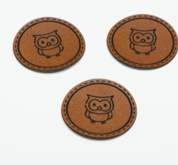 Štítek na oblečení kulatý "sovička", koženkový, hladký povrch