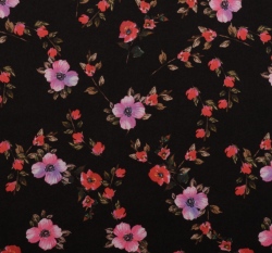 Silky / umělé hedvábí / pavučinka potisk jarní kvítka na černé