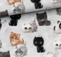 Teplákovina potisk chlupatá koťátka na světle šedé