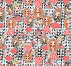 Teplákovina potisk dívky mezi černými puntíky na bílé