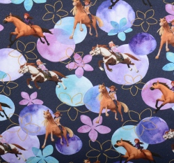 Úplet potisk dívky na koni mezi lila květy na modrošedé