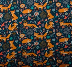Bavlněný úplet liška neposeda na tmavě modré