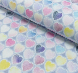 Teplákovina potisk barevná srdíčka v řadách na šedé