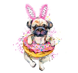 Panel mopsík v čelence se zaječíma ušima v růžovém donutu