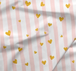 Teplákovina potisk zlatá srdíčka na růžovo-bílých proužcích