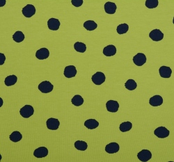 Teplákovina potisk nepravidelné tmavě modré puntíky na zelené, BIO