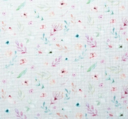 Dvojitá gázovina / mušelín květy s větvičkami na šedo-fialkové