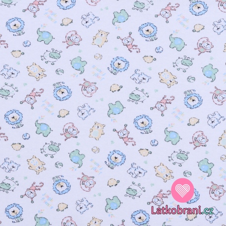 Bavlněný úplet modrá zvířátka z džungle na smetanové