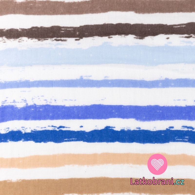 Dvojitá gázovina / mušelín malované proužky do modra na bílé