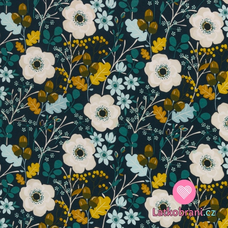 Teplákovina potisk podzimní kvítí na petrolejové, lehce počesaná